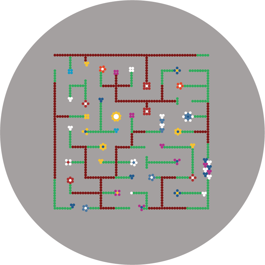 Jest to plansza do zabaw na spostrzegawczość, koncentrację, orientację w przestrzeni. Gra jest pewnego rodzaju łamigłówką, zmuszającą do myślenia i rozwagi. W labirynt można grać indywidualnie, jak i zespołowo. Kropki mogą mieć wiele znaczeń. Przykładowo można przypisać do danego koloru pytanie lub ćwiczenie ruchowe. Mnogość wariantów jest zależna tylko od wyobraźni gracza :)