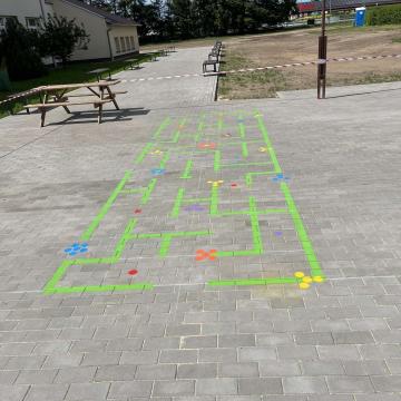 Stopy (Step by step) Dwóch graczy z drużyn przeciwnych stojąc w samym środku labiryntu plecami do siebie, skaczą po kropkach muszą trafić jak najszybciej do wyjścia. Dodatkowo muszą głośno liczyć ilość skoków. Dla utrudnienia na ich trasie określone wcześniej kolorem kropki będą dodatkowymi zadaniami ruchowymi (przysiad, 3 podskoki itp.). To wszystko może utrudniać wyjście z labiryntu, jaki i wydłużyć czas przejścia. Zalecamy pobranie aplikacji stoper. Głuchy telefon Gracz musi przejść labiryntem podskakując na jednej nodze. Na drodze w labiryncie stoją gracze z drużyny przeciwnej, rozstawieni na kropkach. Każdy z nich ma do powiedzenia na ucho po jednym słowie. Wszystkie słowa tworzą zdanie. Zadaniem gracza jest jego zapamiętanie i wypowiedzenie na głos po wyjściu z labiryntu. W ogólnej punktacji będzie liczył się czas przejścia labiryntu, prawidłowe podskoki na jednej nodze oraz jak najwięcej zapamiętanych wyrazów. Skojarzenie Gracz przeskakuje labirynt kropkami, a sędzia co pewien czas zatrzymuje go na danym określonym kolorze. Wtedy gracz musi przystanąć i w 9 sekund wymienić 3 określenia, które związane są z tym kolorem, przykładowo: niebieski - woda, niebo, kamień.