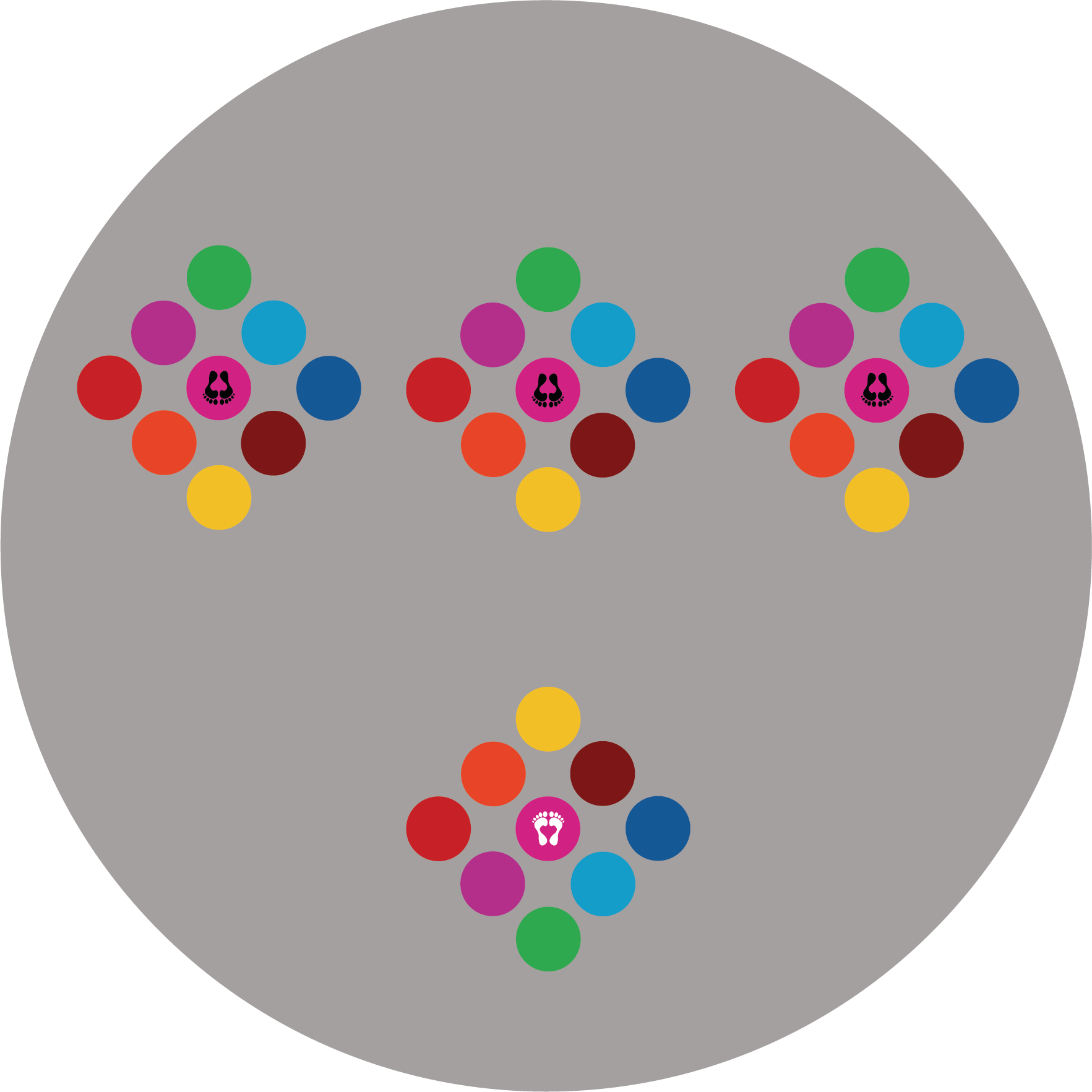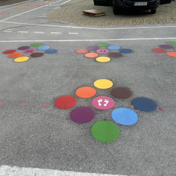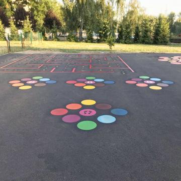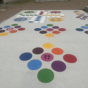 Taniec Wybieramy podkład muzyczny. Uczestnicy tańczą do rytmu, starając się precyzyjnie poruszać tylko po kolorowych polach planszy. Skojarzenia Skacząc po kolorowych polach planszy, uczestnicy mają za zadanie dobrać do koloru właściwe wyrazy z wybranej grupy (np. owoce, warzywa, kwiaty). Plansza może służyć do tworzenia rymów po polsku lub w językach obcych (np. red-bread, green-screen) oraz innych zabaw inspirowanych kolorami. Kółko i krzyżyk W połączeniu z sześcioma woreczkami, trzema czarnymi i trzema białymi, na polach planszy można rozegrać drużynową grę w kółko i krzyżyk. Dwie drużyny ustawiają się w tej samej odległości od planszy i na sygnał, pierwsi zawodnicy z każdego zespołu, kładą woreczki na polach planszy. Wracając, po dotknięciu ręki kolejnego zawodnika – ten rusza i ustawia kolejny woreczek. Po trzeciej osobie, każdy kolejny gracz biegnie już bez woreczka, jedynie może przekładać wcześniej położone woreczki, aby w jednej linii pionowej, poziomej lub przekątnej zostawić trzy woreczki swojej drużyny. Zwierciadło Lider w rytm muzyki przez 3, 6 lub 9 sekund prezentuje układ choreograficzny. Zadaniem naśladującego/naśladujących jest jak najlepsze odtworzenie wszystkich elementów układu. Krzywe Zwierciadło Lider prezentuje układ choreograficzny. Zadaniem naśladującego jest parodiowanie ruchów i gestów lidera, dla rozśmieszenia wszystkich uczestników zabawy. Pomniki Lider bądź liderzy prezentują grupie figurę akrobatyczną na polach planszy, zadaniem pozostałych graczy jest dokładne powtórzenie figury i utrzymanie jej przez jak najdłuższy czas (polecamy uzbroić się w aparat fotograficzny by uwiecznić co śmieszniejsze/ciekawsze akrobacje).
